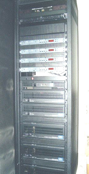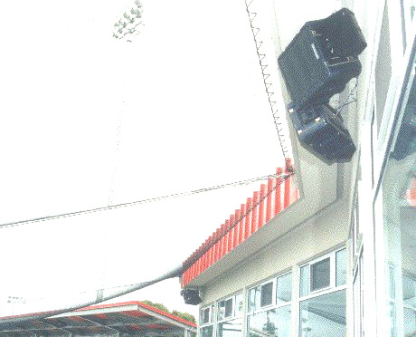 A single QSC CX4T 70 volt amp provides the power for the ceiling mounted internal loudspeakers’ though-out the press and sky boxes. The balance of the system consists of a Mackie 1402 mixer, Marantz Pro model PMD320 compact disc and PMD 501 cassette players, Peavey delays, a Williams ALS system, Behringer compressors and SM58 microphones.