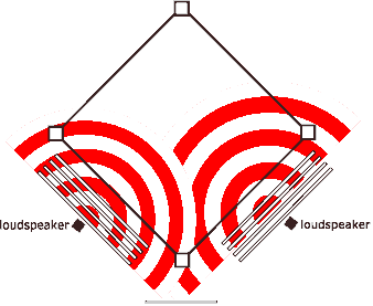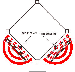 • Installing loudspeakers facing each stand area seems is somewhat better than the first approach, but it still has problems.